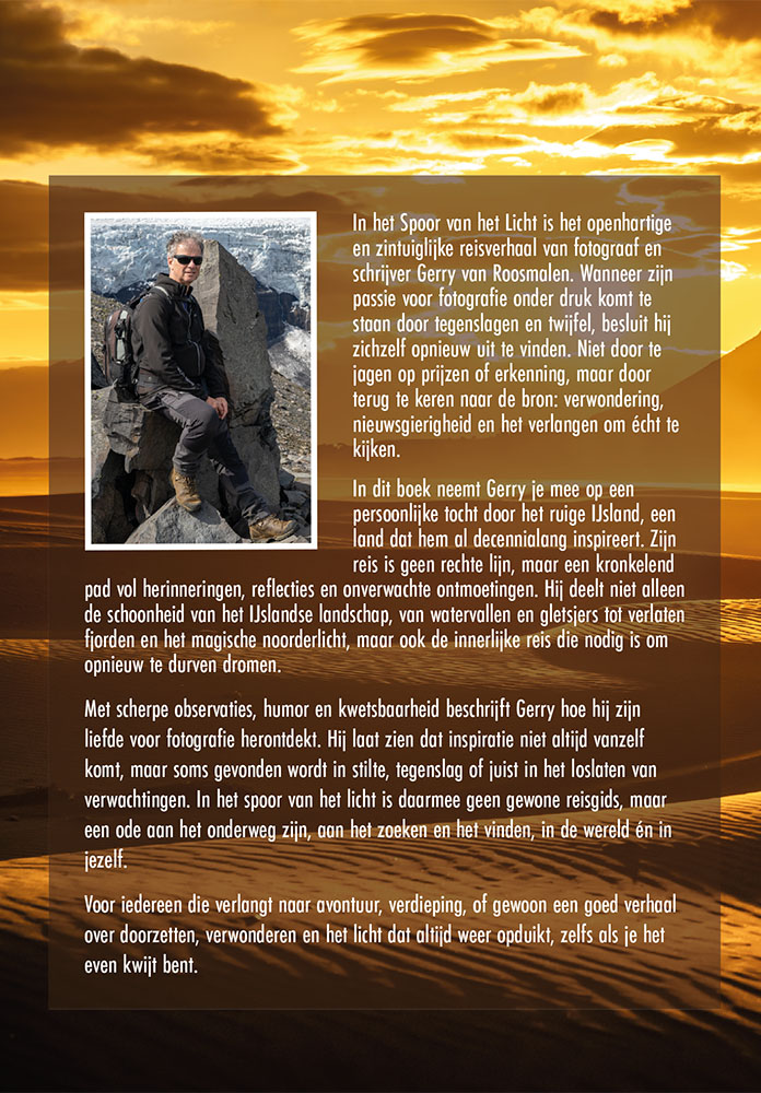 Met scherpe observaties, humor en kwetsbaarheid beschrijft Gerry hoe hij zijn liefde voor fotografie herontdekt. Hij laat zien dat inspiratie niet altijd vanzelf komt, maar soms gevonden wordt in stilte, tegenslag of juist in het loslaten van verwachtingen. In het spoor van het licht is daarmee geen gewone reisgids, maar een ode aan het onderweg zijn, aan het zoeken en het vinden, in de wereld én in jezelf.